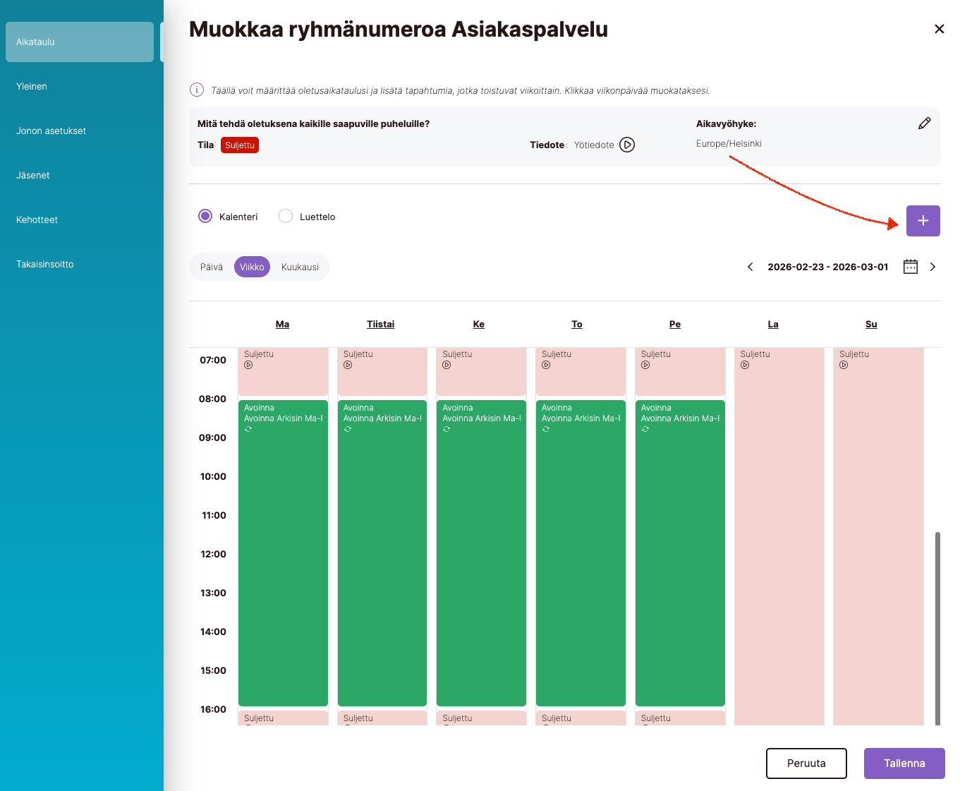 3) Voit halutessasi tuoda julkisesta arkipyhäkalenterista automaattisesti Suomen arkipyhät "Lisää yleisiä vapaapäiviä" tai lisää yksittäinen poikkeustila "Lisää aikaväli" painikkeesta.
