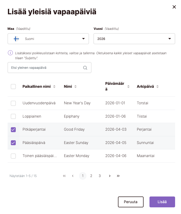 Valitse haluamasi arkipyhät yksitellen tai vaikka kaikki kerralla, valitse lisää ja Tallenna