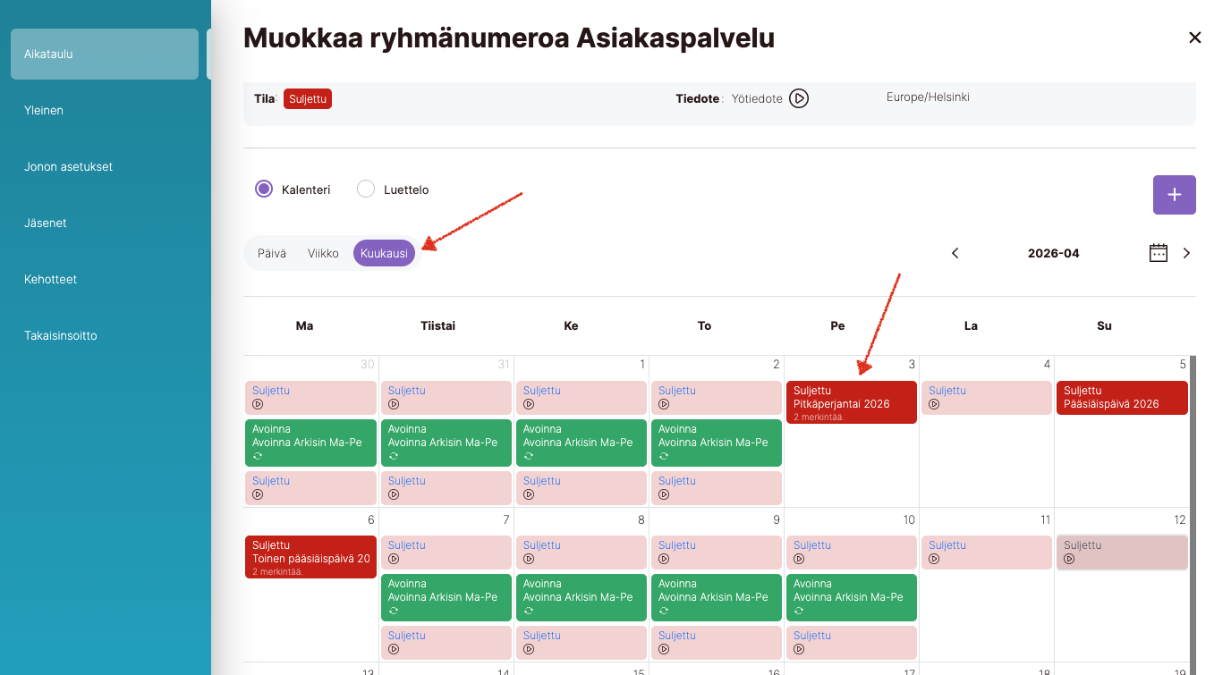 Oletuksena lisätyt arkipyhät ovat "Suljettu" tilassa, jos haluat muokata arkipyhän aikataulua tai tiedotetta, voit valita kuukausinäkymän ja etsi ja valitse arkipyhä klikkaamalla kalenterista päivän aikataulua.